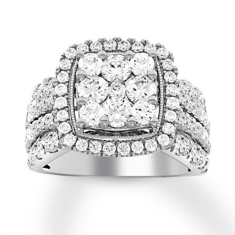 The brilliant center of this modern engagement ring features tightly nestled round diamonds arrayed in a square, further framed by additional diamonds. The generous 14K white gold band is awash in more diamonds, bringing the total weight to 3 carats.