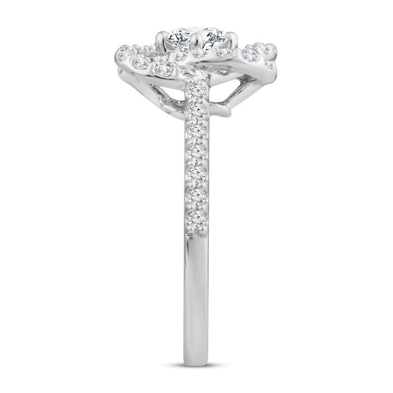 This eye-catching diamond ring features a unique interwoven design to symbolize the strength of love and keeping you centered. Crafted of 14K white gold, the ring features a beautiful round center diamond and dazzles with round diamonds throughout, bringing its total diamond weight to 1 carat.